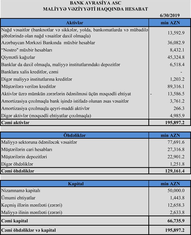 “Bank Avrasiya” ASC 2019-cu ilin 1-ci yarısını 2 milyon 634 min manat xalis mənfəət ilə başa vurub. Bu, 2019-cu ilin eyni dövrü ilə müqayisədə 2 milyon 12 min manat və ya 43,3% azdır. Belə ki, Bank 2018-ci ilin 1-ci yarısını 4 milyon 645 min manat xalis mənfəət ilə bağlamışdı.