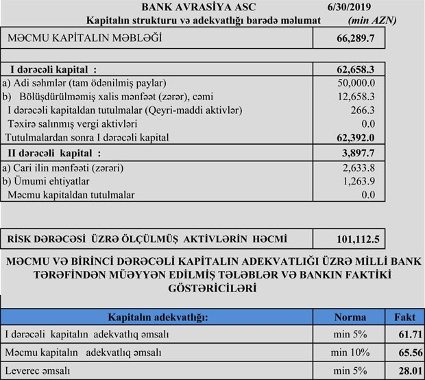 30 İyun 2019-cu il tarixində “Bank Avrasiya” 66 milyon 289 min manat məcmu kapitala malik olub.
