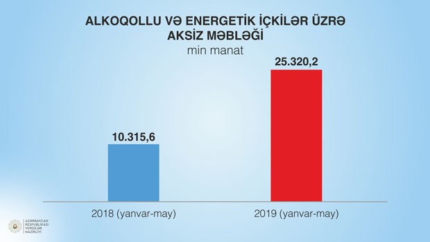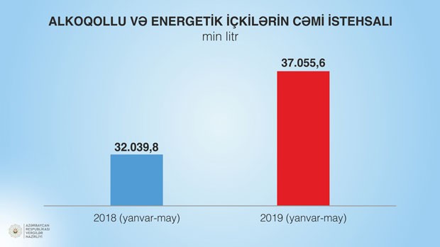 Məlumatda qeyd edilib ki, 2019-cu ilin yanvar-may aylarında alkoqollu məhsullar və energetik içkilərin istehsalı (aksiz vergisinə cəlb olunan istehsal həcmi) ötən ilin müvafiq dövrü ilə müqayisədə 15,7 faiz, aksiz məbləği 2,5 dəfə, alkoqollu içkilərin istehsalçılarının dövriyyəsi isə 1,6 dəfə artıb.