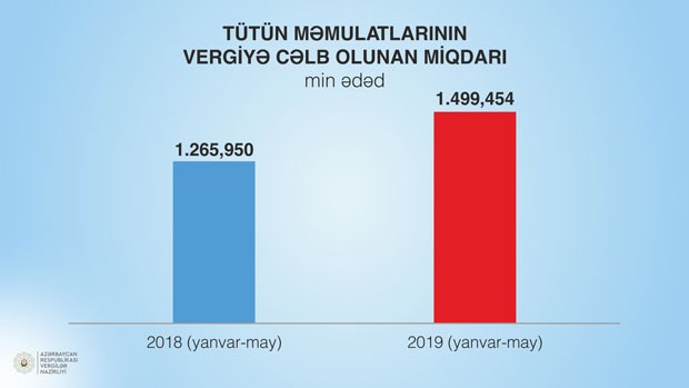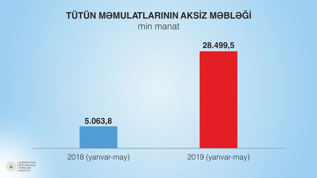 Cari ilin 5 ayında ötən ilin 5 ayı ilə müqayisədə, tütün məmulatlarının istehsalçıları üzrə tütün məmulatlarının vergiyə cəlb olunan miqdarı 18,4 faiz, aksiz məbləği 5,6 dəfə, tütün məmulatlarının istehsalçıları üzrə dövriyyə isə 3,7 dəfə artıb. Bu sektorda artımlar əsasən yeni istehsal müəssisələrinin yaranması, eyni zamanda, istehsal həcminin və dövriyyələrin şəffaflaşması şəraitində mümkün olub.