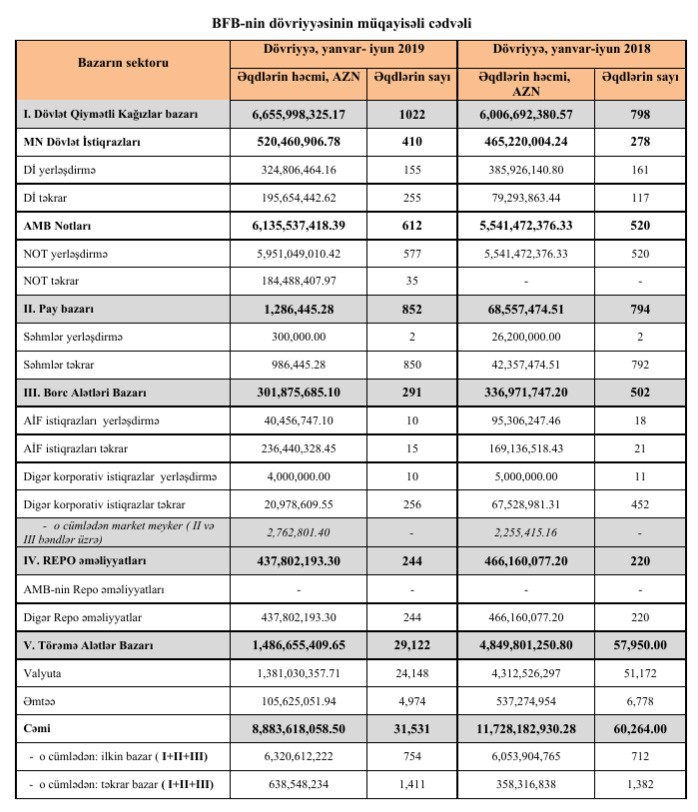 2019-cu il yanvar-iyun ayları ərzində Bakı Fond Birjasında bütün alətlər üzrə keçirilən əqdlərin ümumi həcmi 8 milyard 883 milyon 618 min manat təşkil edib. Bu, 2018-ci ilin eyni dövrü ilə müqayisədə 24,3% azdır.