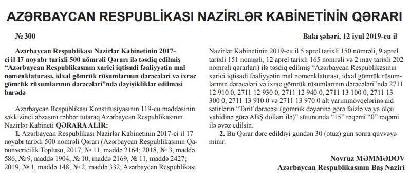 Nazirlər Kabineti “Azərbaycan Respublikasının xarici iqtisadi fəaliyyətin mal nomenklaturası, idxal gömrük rüsumlarının dərəcələri və ixrac gömrük rüsumlarının dərəcələri”ndə dəyişikliklər edib.