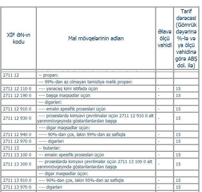Belə ki, emalın spesifik prosesləri üçün, proseslərdə kimyəvi çevrilmələr üçün, təmizliyi 90 %-dən çox, lakin 99 %-dən az olan propanlar və emalın spesifik prosesləri üçün, proseslərdə kimyəvi çevrilmələr üçün, təmizliyi 90 %-dən çox, lakin 95 %-dən az olan butanlar 15 faiz idxal gömrük rüsumundan azad edilib.