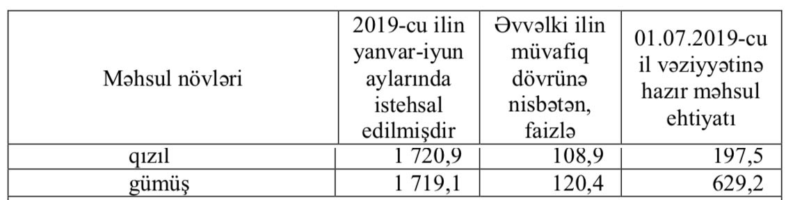 2019-cu ilin yanvar-iyun aylarında Azərbaycanda 1720,9 kq qızıl hasil olunub ki, bu da ötən ilin müvafiq dövrünün göstəricisindən 8,9% çoxdur.