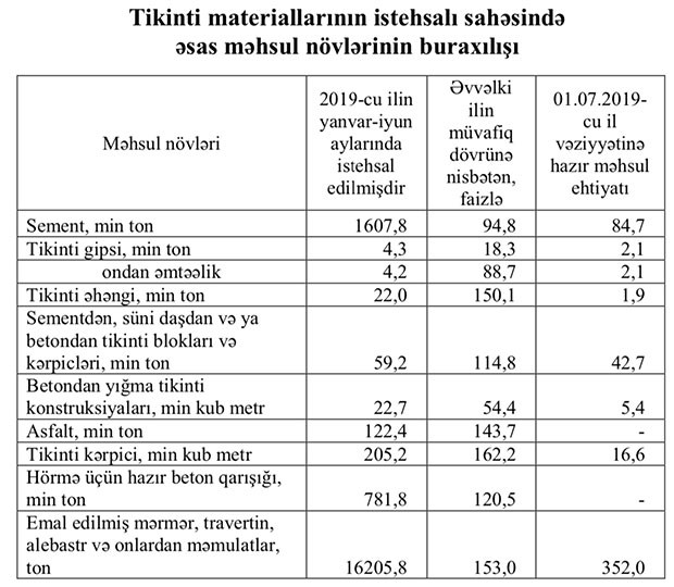 “Marja” Dövlət Statistika Komitəsinin yarımillik hesabatına istinadən xəbər verir ki, il 6 ayda betondan yığma tikinti konstruksiyalarının istehsalı 45,6 faiz, tikinti gipsinin istehsalı 81,7 faiz azalmışdır.