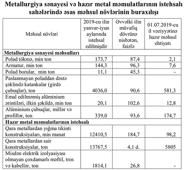 2019-cu ilin yanvar-iyun aylarında armatur istehsalı da azalıb. 2019-cu ilin yanvar-iyun aylarında 144,3 min ton armatur istehsal edilmişdir ki, bu da əvvəlki ilin müvafiq dövrünə nisbətən 3,7% azdır.