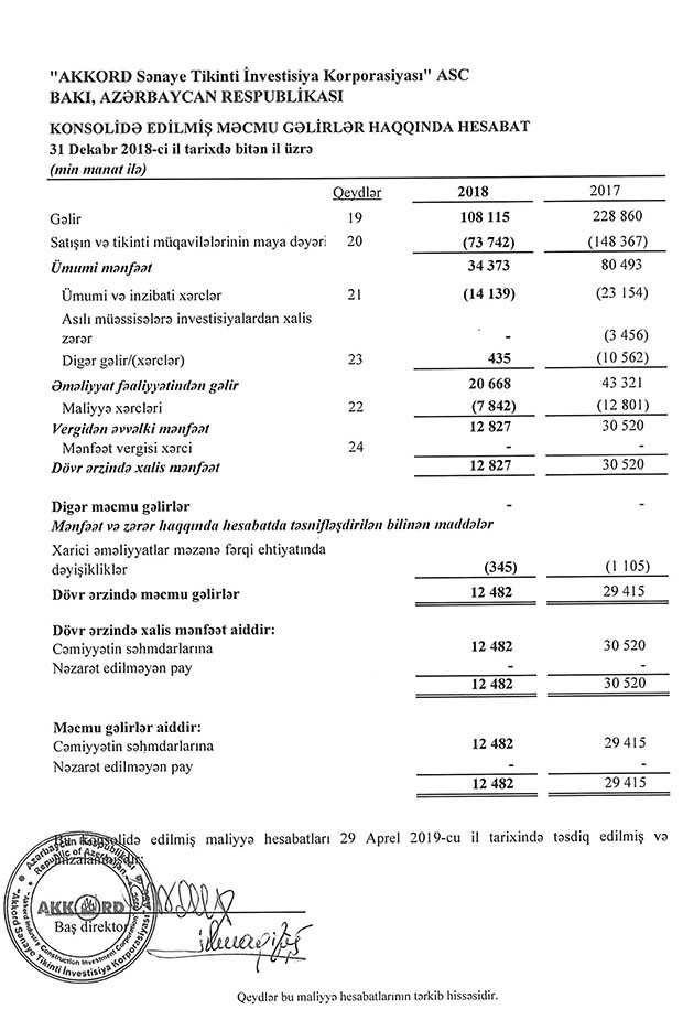 “Akkord Sənaye Tikinti İnvestisiya Korporasiyası” ASC 2018-ci ili 12 milyon 482 min manat xalis mənfəət ilə başa vurub. Bu, 2017-ci illə müqayisədə 2,3 dəfə azdır. ASC 2017-ci ili 29 milyon 415 min manat xalis mənfəət ilə bağlamışdı. Xalis mənfəətin azalması “Akkord”un tikinti müqavilələrindən gəlirlərinin azalması ilə bağlıdır.
