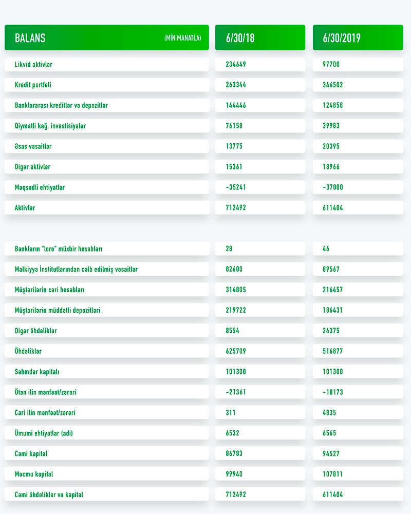 Ötən ilin 1-ci yarısının sonu ilə müqayisədə “Rabitəbank”ın müştərilərə verdiyi cəmi kreditlər 83 milyon 158 min manat və ya 31,6% artaraq 30 İyun 2019-cu il tarixində 346 milyon 502 min manata çatıb. Ötən 12 ay ərzində Bankın aktivləri isə 101 milyon 88 min manat və ya 14,2% azalaraq 611 milyon 404 min manata düşüb. Aktivlərin azalmasının səbəbi likvid aktivlərin azalmasıdır. Öhdəliklərdə yer alan müştərilərin cari hesablarındakı vəsaitlərin 98 milyon 348 min manat və ya 31,2% azalaraq 216 milyon 457 min manata düşməsilə əlaqədar olaraq likvid aktivlər də azalıb.