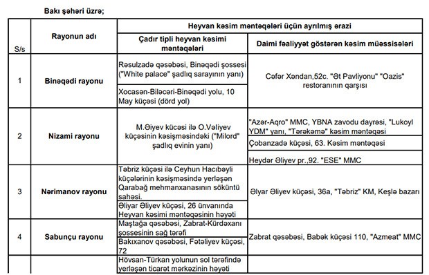 Qurban bayramı dövründə Bakı şəhərinin rayonları və regionlar üzrə heyvan kəsimi məntəqələrinin dislokasiya yerləri haqqında