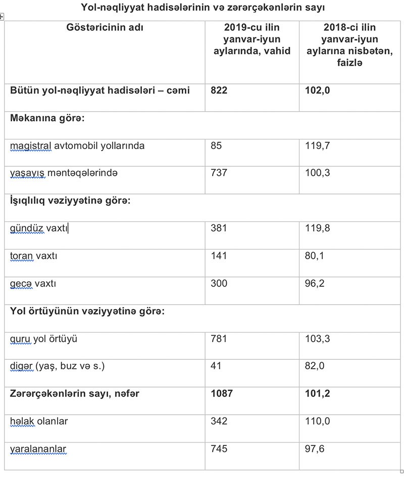 2019-cu ilin yanvar-iyun aylarında ölkənin avtomobil yollarında 822 və ya 2018-ci ilin müvafiq dövrü ilə müqayisədə 2,0 faiz çox yol-nəqliyyat hadisəsi baş vermiş, bu hadisələr nəticəsində zərər çəkən şəxslərin sayı 1,2 faiz artaraq 1087 nəfər olmuşdur.