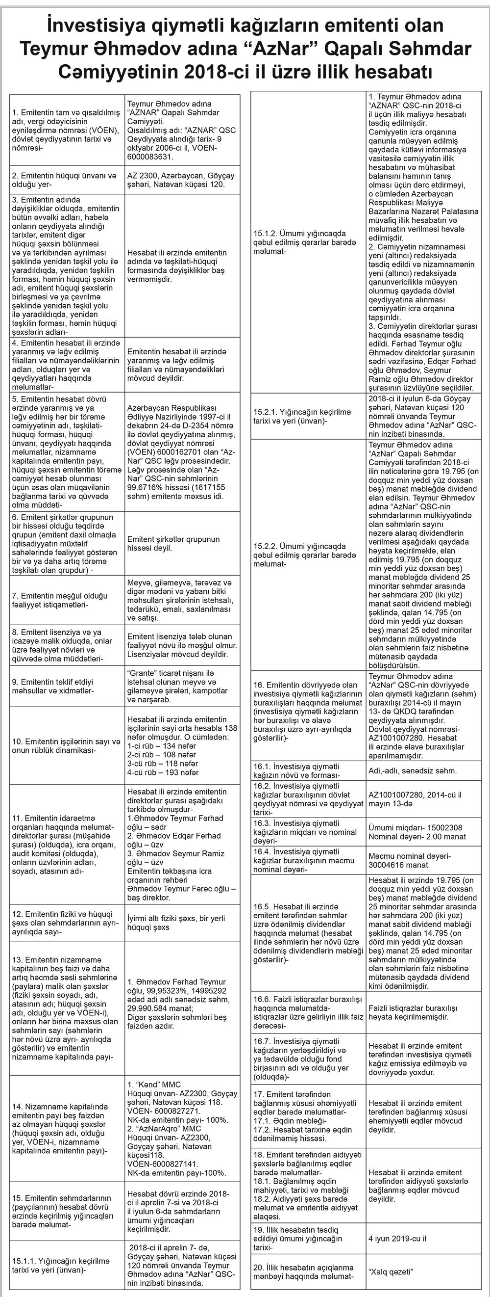 “Grante” ticarət nişanı ilə meyvə və giləmeyvə şirələri, kampotlar və narşərab isrehsal edən Teymur Əhmədov adına “AZNAR” Qapalı Səhmdar Cəmiyyəti 2018-ci il üzrə 19 min 795 manat məbləğdə dividend elan edib.