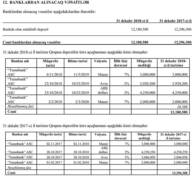 “Marja” təşkilatın illik hesabatına istinadən xəbər verir ki, ötən ilin sonunda “Aqrarkredit”in “Turanbank” ASC-də 12 milyon 181 min manat depoziti olub. Depozitlərin 7 milyon 170 min manatı ABŞ dollarında illik 2% ilə, 5 milyon manatı isə milli valyutada illik 7%-lə “Turanbank”da yerləşdirilib.