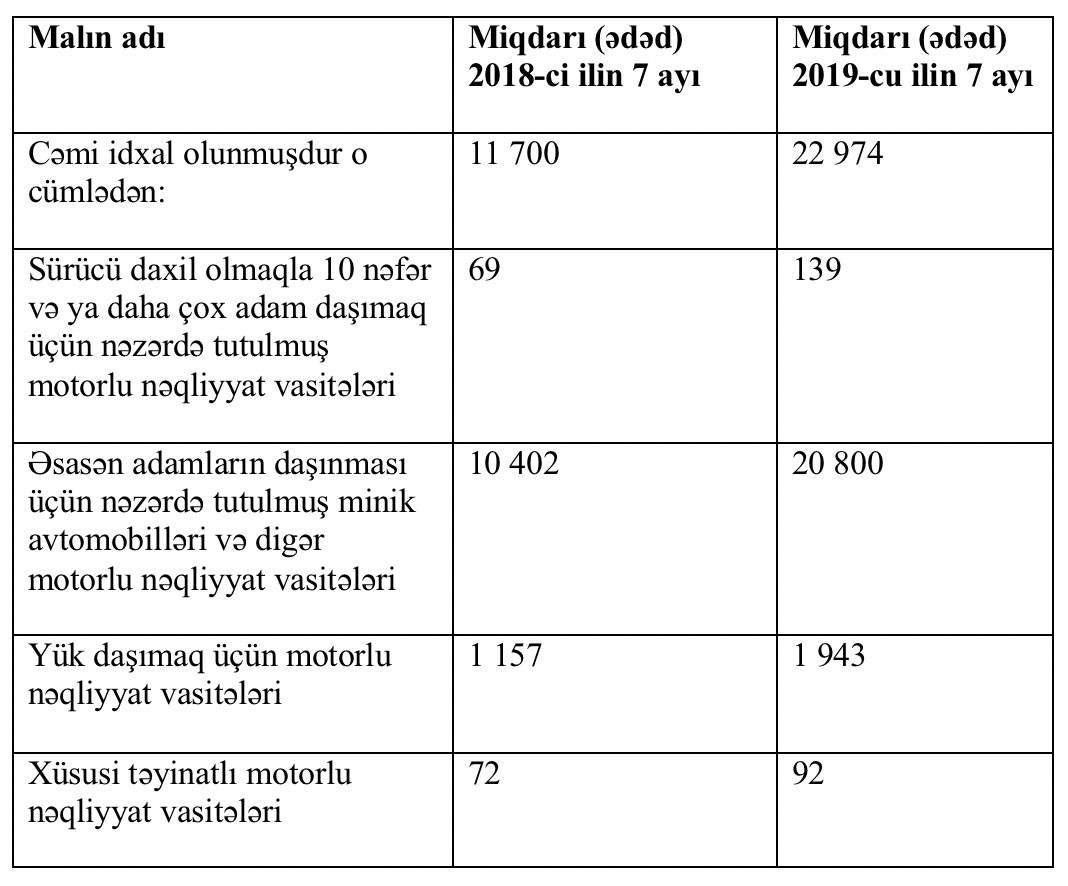 Müqayisə üçün qeyd edək ki, 2018-ci ilin Yanvar-İyul dövründə 10 min 402 ədəd minik avtomobili, 69 ədəd avtobus, 1 157 ədəd yük avtomobili və 72 ədəd xüsusi təyinatlı vasitə idxal olunmuşdu.