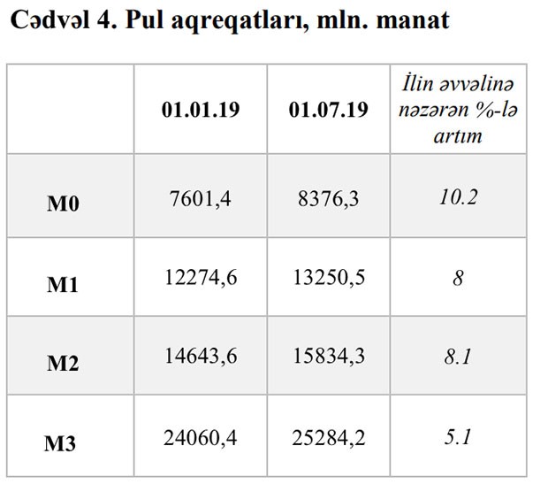 İcmalda qeyd edilib ki, 2019-cu ilin 6 ayı ərzində manatla pul bazası 8.7% artmış və dövrün sonuna 10 milyard 376.9 milyon manat təşkil etmişdir. Büdcə xərcləmələri və bank sisteminin likvidlik mövqeyi pula tələbin mühüm amilləri olaraq qalmışdır. Hökümət hesablarının qalığının dəyişimi pul bazasına I rübdə azaldıcı, II rübdə isə artırıcı təsir göstərmişdir.