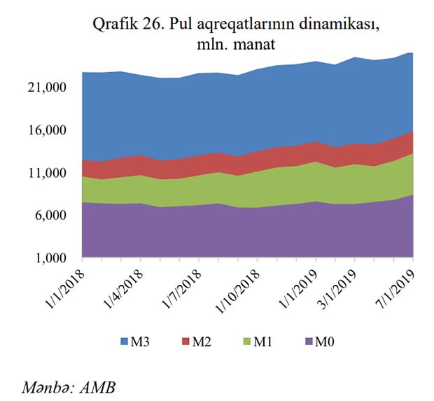 Hesabat dövründə geniş pul kütləsi (M3) 5.1% artmış və dövrün sonuna 25 milyard 284.2 milyon manat təşkil etmişdir.