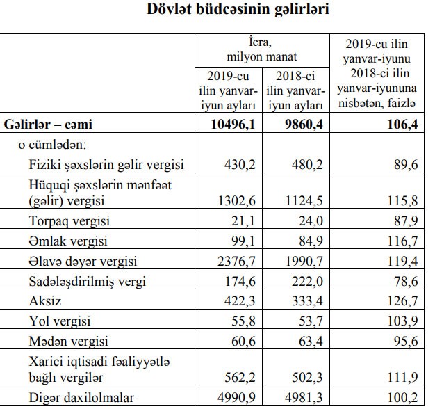 2019-cu ilin yanvar-iyun ayları ərzində 2018-ci ilin yanvar-iyununa nisbətən dövlət büdcəsinə daxil olmuş fiziki şəxslərin gəlir vergisi 10,4% azalaraq 430,2 milyon manata, torpaq vergisi 12,1% arzalaraq 21,1 milyon manata, sadələşdirilmiş vergi 22,4% azalaraq 174,6 milyon manata, mədən vergisi 4,4% azalaraq 60,6 milyon manata geriləyib.