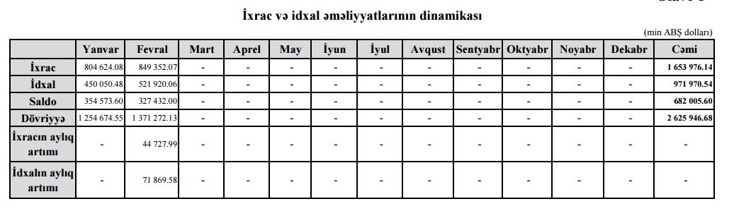 Fevralda ixrac 849 milyon 352.07 min dollar, idxal 521 milyon 920.06 min dollar, saldo (ticarət profisiti) isə 327 milyon 432 min dollar təşkil edib.