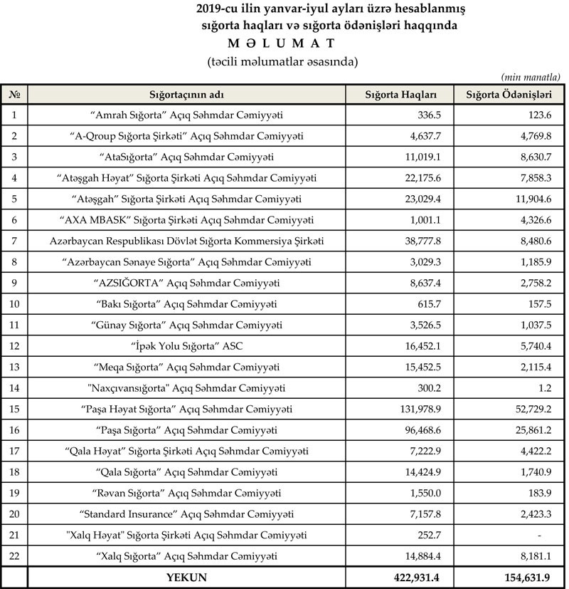 Müqayisə üçün qeyd edək ki, 2018-ci ilin yanvar-iyul ayları ərzində ölkədə fəaliyyət göstərən 21 sığorta şirkəti tərəfindən 459.9 mln. manat məbləğində sığorta haqları toplanmış, 145.9 mln. manat məbləğində sığorta ödənişi həyata keçirilmişdi.