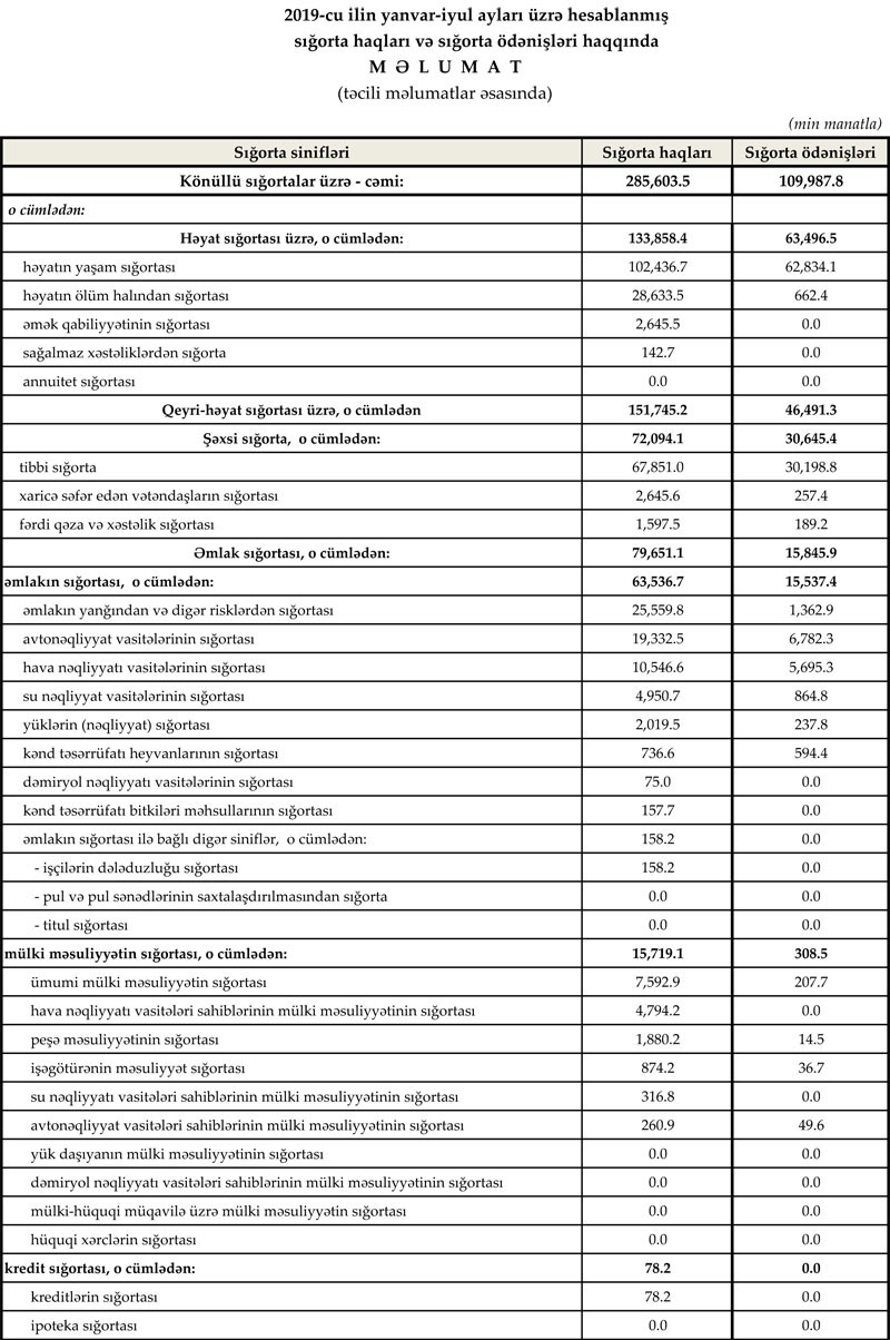 2019-cu ilin yanvar-iyul aylarında könüllü sığorta bazarı üzrə haqlar 285.6 mln. manat, ödənişlər isə 110 mln. manat təşkil edib. İcbari sığorta bazarı üzrə haqlar 137.3 mln. manat, ödənişlər isə 44.6 mln. manat olub.