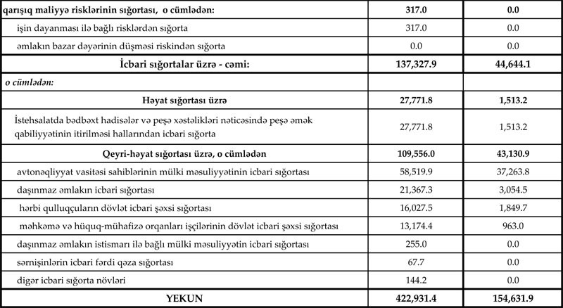 Keçən ilin analoji dövrü ilə müqayisədə avtonəqliyyat vasitəsi sahiblərinin mülki məsuliyyətinin icbari sığortası üzrə ödənişlərdə 8 mln. manat, hava nəqliyyatı vasitələrinin sığortası üzrə 5.4 mln. manat artım, tibbi sığortada isə 5.2 mln. manat azalma baş verib. Bu növlər üzrə ödənişlər müvafiq dövr ərzində hadisənin baş vermə intensivliyindən asılı olaraq dəyişib.