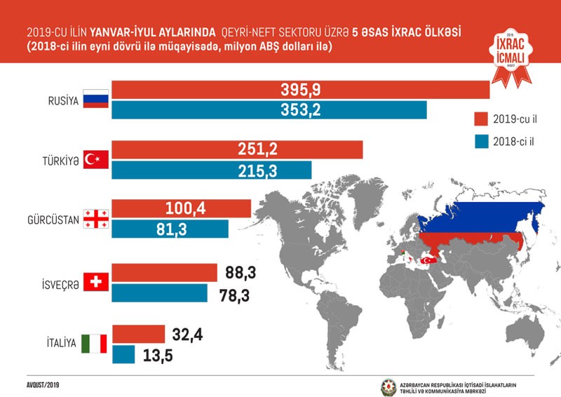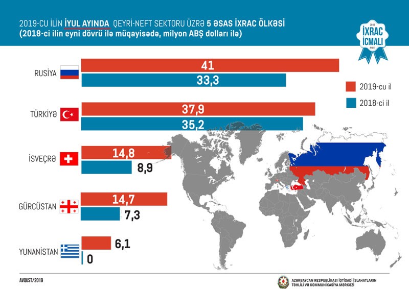 Cari ilin yanvar-iyul ayları ərzində Rusiyaya 395,9 milyon, Türkiyəyə 251,2 milyon, Gürcüstana 100,4 milyon, İsveçrəyə 88,3 milyon və İtaliyaya 32,4 milyon ABŞ dolları dəyərində qeyri-neft sektoruna aid mal ixrac olunub. 2018-ci ilin müvafiq dövrü ilə müqayisədə 2019-cu ilin 7 ayında Rusiyaya qeyri-neft ixracı 12 faiz, Türkiyəyə 17 faiz, Gürcüstana 23 faiz, İsveçrəyə 13 faiz və İtaliyaya 2,4 dəfə artıb.