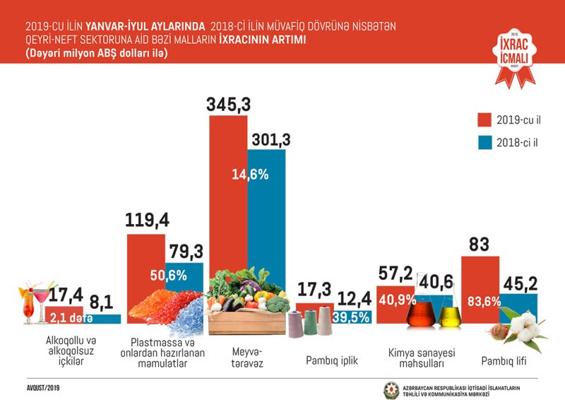 2018-ci ilin müvafiq dövrü ilə müqayisədə cari ilin yanvar-iyul aylarında pambıq lifinin ixracı 83,6 faiz, alkoqollu və alkoqolsuz içkilərin ixracı 2,1 dəfə, kimya sənayesi məhsullarının ixracı 40,9 faiz, pambıq ipliyinin ixracı 39,5 faiz, plastmassa və onlardan hazırlanan məmulatların ixracı 50,6 faiz, meyvə-tərəvəzin ixracı 14,6 faiz, şəkər ixracı 10,7 faiz artıb.