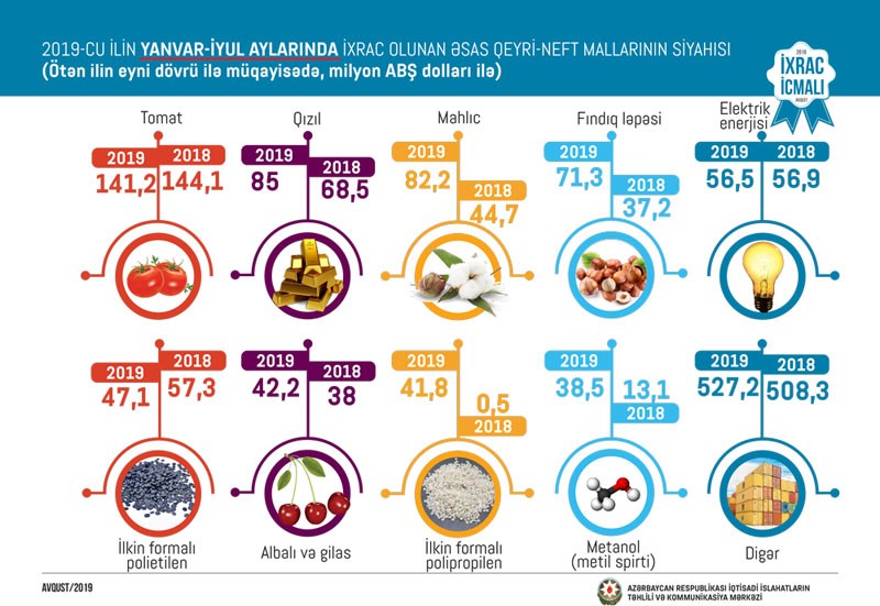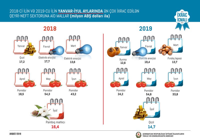 2019-cu ilin yanvar-iyul ayları ərzində ixrac edilən qeyri-neft sektoruna aid malların siyahısında isə pomidor (141,2 milyon ABŞ dolları) liderliyini qoruyub. Bu siyahıda qızıl (sikkə kəsilməsində istifadə olunmayan, digər emal olunmamış formalarda – 85 milyon ABŞ dolları) ikinci və pambıq mahlıcı (82,2 milyon ABŞ dolları) üçüncü yerdə qərarlaşıb.