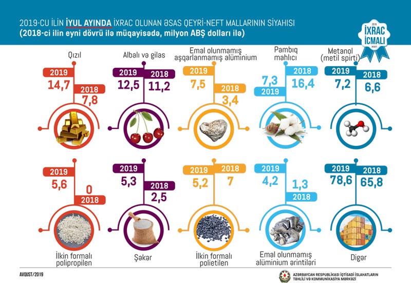 2019-cu ilin iyul ayında qeyri-neft sektoru üzrə ixracda qızıl (sikkə kəsilməsində istifadə olunmayan, digər emal olunmamış formalarda - 14,7 milyon ABŞ dolları) birinci, albalı və gilas (12,5 milyon ABŞ dolları) ikinci, emal olunmamış aşqarlanmamış alüminium (7,5 milyon ABŞ dolları) üçüncü olub.