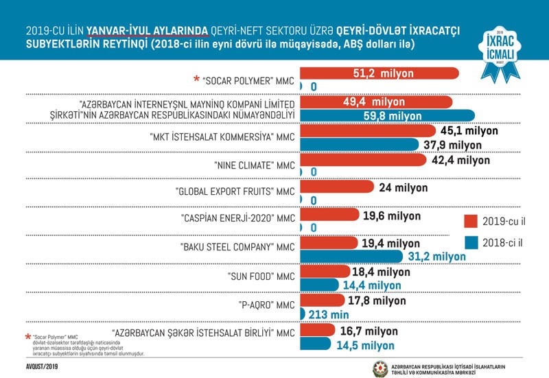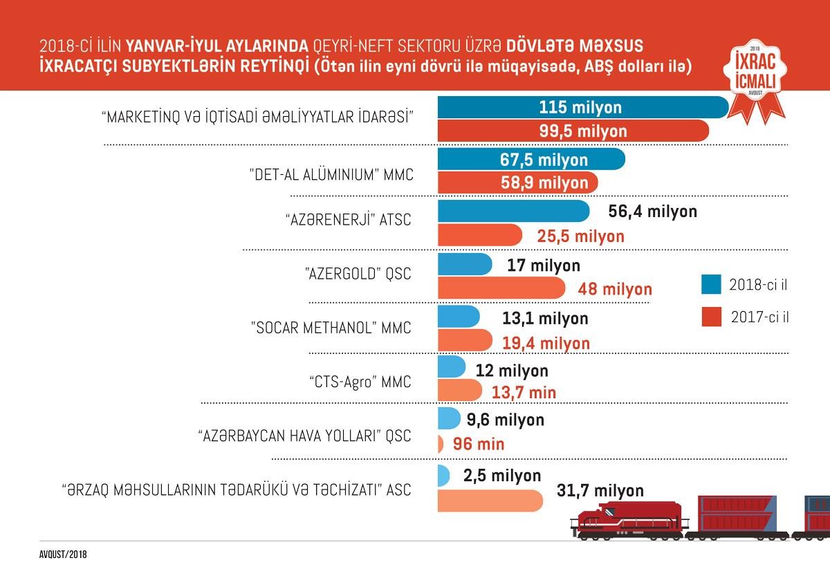 Müqayisə üçün qeyd edək ki, 2018-ci ilin yanvar-iyul aylarında qeyri-neft sektoru üzrə qeyri-dövlət ixracatçı subyektlərin siyahısında ilk onluqda “Azərbaycan İnterneyşnl Mayninq Kompani Limited Şirkəti”nin Azərbaycan Respublikasındakı nümayəndəliyi, "Kapitan Fruits" MMC, "MKT İstehsalat Kommersiya" MMC, "Baku Steel Company" MMC, "Qala meyvə-tərəvəz ixracat idxalat" MMC, “Food Export Şəmkir” MMC, “Azfruittrade” MMC, “Şirin Aqro” QSC, İskəndərov Sahib Səməd oğlu, "Azərbaycan Şəkər İstehsalat Birliyi" MMC təmsil olunurdu.