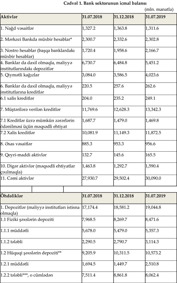 Maliyyə Bazarlarına Nəzarət Palatası 31 iyul 2019-cu il tarixinə Bank sektorunun icmal göstəricilərini açıqlayıb. "Marja", müqayisələrin asan aparılması və vəziyyətin daha aydın başa düşülməsi üçün 31 iyul 2019-cu il tarixinə göstəricilər ilə bərabar 31 iyul 2018-ci il və 31 Dekabr 2018-ci il tarixinlərinə olan icmal göstəriciləri də təqdim edir.