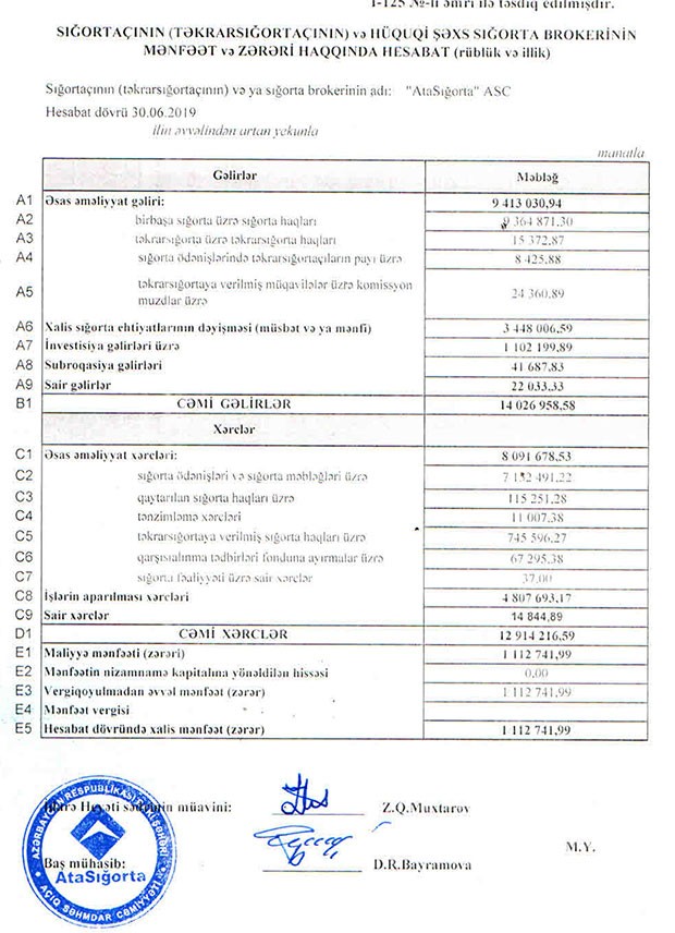Ötən il "AtaSığorta" sığorta ehtiyatının yaradılmasına 3 milyon 216 min manat ayırdığından xərcləri gəlirlərini üstələmişdi. Bu ilin 1-ci yarısında isə ehtiyatın 3 milyon 448 min manatı azad olub və gəlirə əlavə edilib.