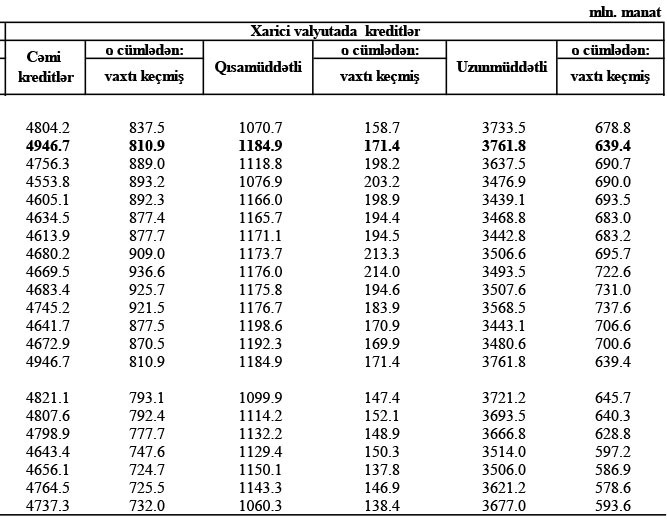 Xarici valyutada kreditlərin isə 22,4%-ni və ya 1 milyard 60.3 milyon manatını qısamüddətli, 77,6%-ni və ya 3 milyard 677 milyon manatını uzunmüddətli kreditlər təşkil edib.
