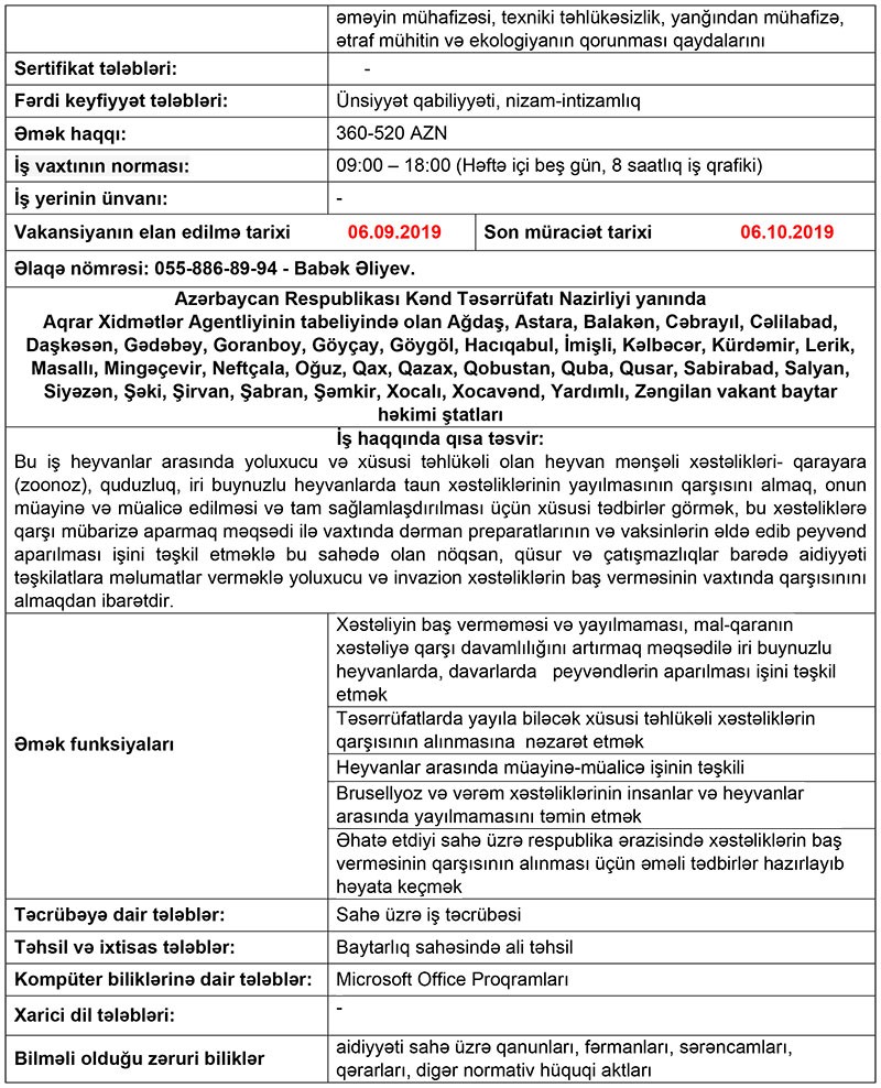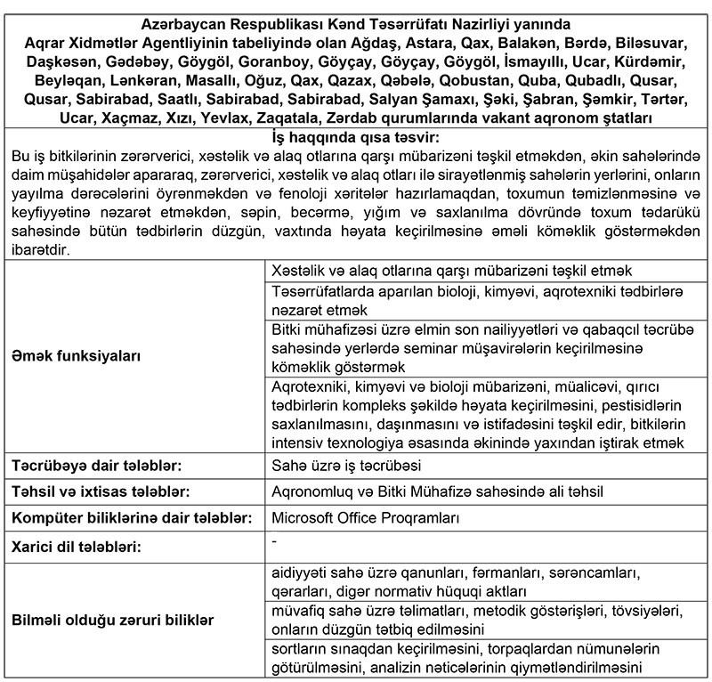 Elana əsasən, nazirlik tərəfindən aqronom, baytar həkimi, baytar feldşeri, laborant və traktorçular vakant yerlər üzrə işə qəbul ediləcəklər.