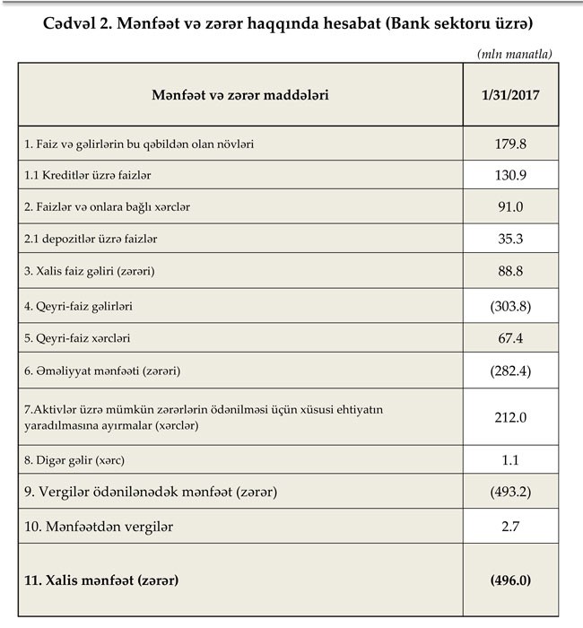 Azərbaycanın bank sektoru 2016-cı ili 1 milyard 668 milyon manat zərər ilə başa vurmuş, kredit və depozit itkiləri üzrə ehtiyatların yaradılmasına 1 milyard 2012 milyon manat ayırmışdılar.