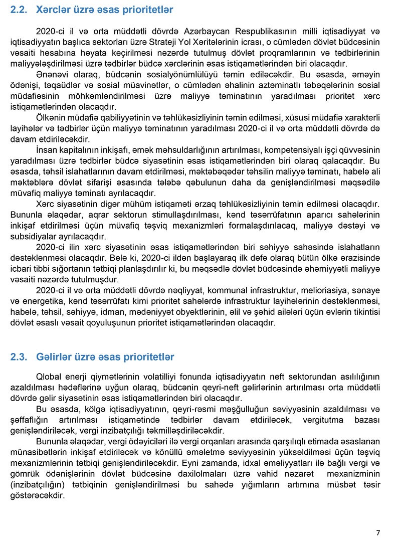 Eyni 9 zamanda, daxili borc üzrə 2020-ci il ərzində 100 milyon manat həcmində yeni (təkrarmaliyyələşən borclar nəzərə alınmadan) borcların cəlb edilməsi proqnozlaşdırılmışdır.