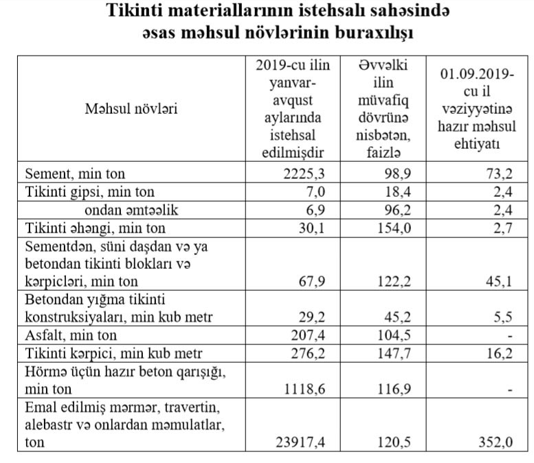 “Marja” Dövlət Statistika Komitəsinin aylıq hesabatına istinadən xəbər verir ki, tikinti kərpicinin istehsalı 47,7 faiz, tikinti əhənginin istehsalı 54 faiz, hörmə üçün hazır beton qarışığının istehsalı 16,9 faiz artmış, sementin istehsalı 1,1 faiz, betondan yığma tikinti konstruksiyalarının istehsalı 54,8 faiz, tikinti gipsinin istehsalı 81,6 faiz azalıb.