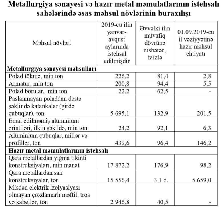 2019-cu ilin yanvar-avqust aylarında armatur istehsalı isə 5,6% azalaraq 200,8 min ton təşkil edib.