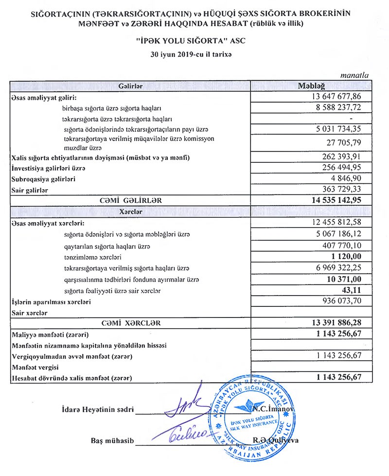 “Marja” Şirkətin yarımillik hesabatına istinadən xəbər verir ki, 2019-cu ilin yanvar-iyun dövründə “İpək Yolu Sığorta” ASC-nin cəmi gəlirləri 14 milyon 535 min manat, cəmi xərcləri 13 milyon 392 min manat təşkil edib. Gəlirlər xərcləri üstələdiyindən Şirkətin 1 milyon 143 min manat mənfəəti yaranıb. “İpək Yolu Sığorta” ilk 6 ayda mənfəət vergisi ödəməyib.