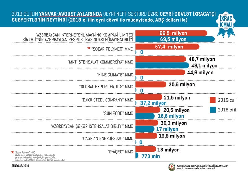Bu ilin yanvar-avqust ayları üzrə hazırlanan qeyri-dövlət ixracatçı subyektlərin reytinqində ilk onluqda aşağıdakı şirkətlər təmsil olunurlar: "Azərbaycan İnterneyşnl Mayninq Kompani Limited Şirkəti"nin Azərbaycan Respublikasındakı nümayəndəliyi, “Socar Polymer” MMC, "MKT İstehsalat Kommersiya" MMC, "Nine Climate" MMC, "Global Export Fruits" MMC, "Baku Steel Company", “Sun Food" MMC, "Azərbaycan Şəkər İstehsalat Birliyi " MMC, "Caspian enerji-2020" MMC, "P-Aqro" MMC..