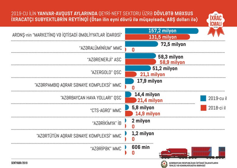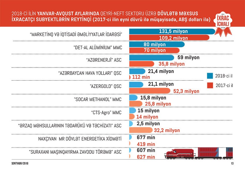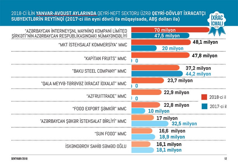 Müqayisə üçün qeyd edək ki, 2018-ci ilin yanvar-avqust ayları üzrə hazırlanan qeyri-dövlət ixracatçı subyeklərin reytinqində ilk onluqda aşağıdakı subyektlər təmsil olunurdular: