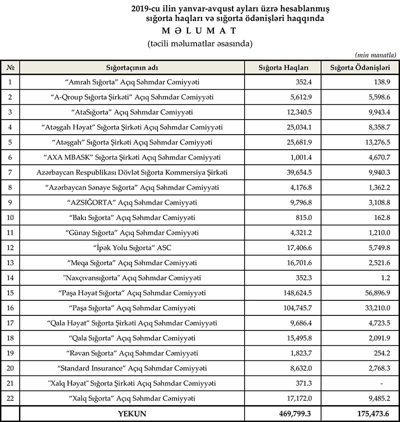 2019-cu ilin yanvar-avqust ayları ərzində sığorta şirkətləri və sinifləri üzrə hesablanmış sığorta haqları və ödənişlərə dair ətraflı məlumatlar sığorta bazarının icmal göstəricilərində öz əksini tapıb.
