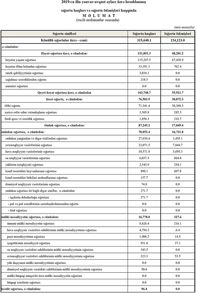 Məlumatda qeyd edilib ki, 2019-cu ilin yanvar-avqust aylarında könüllü sığorta bazarı üzrə haqlar 315.6 mln. manat, ödənişlər isə 124.1 mln. manat təşkil edib. İcbari sığorta bazarı üzrə haqlar 154.2 mln. manat, ödənişlər isə 51.4 mln. manat olub.
