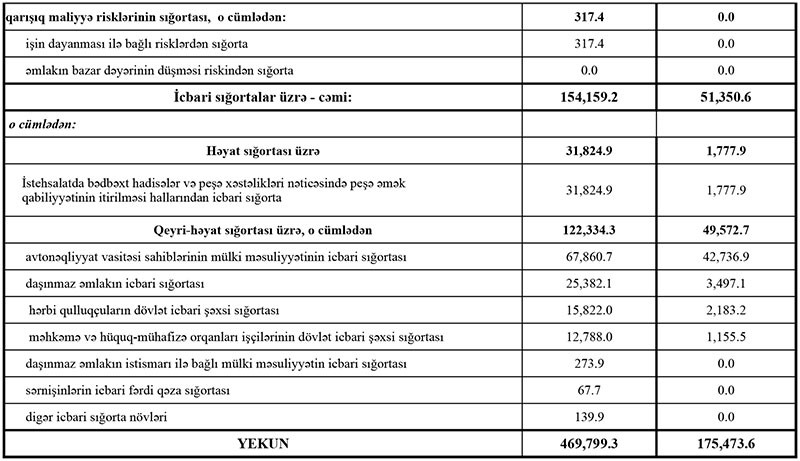 Keçən ilin analoji dövrü ilə müqayisədə avtonəqliyyat vasitəsi sahiblərinin mülki məsuliyyətinin icbari sığortası üzrə ödənişlərdə 8.9 mln. manat, hava nəqliyyatı vasitələrinin sığortası üzrə 5.4 mln. manat, avtonəqliyyat vasitələrinin sığortası üzrə 2 mln. manat artım olub. Azalma isə tibbi sığorta (2.2 mln. manat) və yaşam sığortası (5 mln. manat) üzrə olub. Sözügedən növlər üzrə ödənişlər müvafiq dövr ərzində hadisənin baş vermə intensivliyindən asılı olaraq dəyişib.