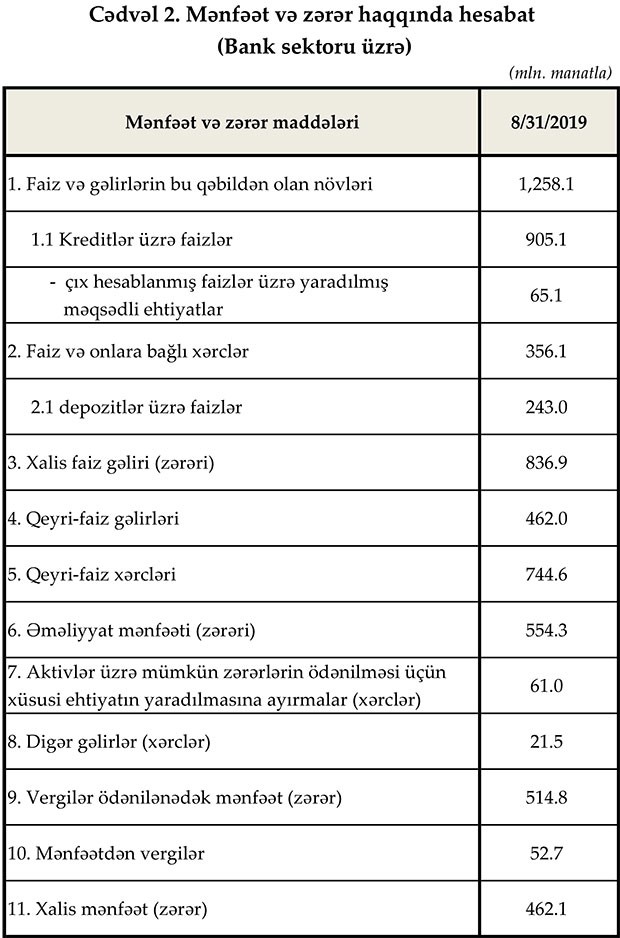 Avqust ayında bankların əməliyyat mənfəəti 17.3% (81.9 milyon manat) artaraq 554.3 milyon manat, xalis mənfəəti isə 13.8% (55.9 milyon manat) artaraq 462.1 milyon manat təşkil edib. Ötən ilin müvafiq dövrü ilə müqayisədə faiz gəlirləri 10.5%, kreditlər üzrə faiz gəlirləri isə 14.3% artmışdır.