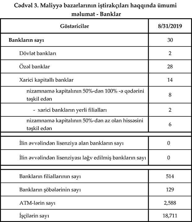 Fəaliyyət göstərən 30 bankdan 14-ü xarici kapitallıdır, bunlardan 7-də xarici kapitalın payı 100% təşkil edir. 30 bankın filiallarının sayı 514, şöbələrinin sayı 129, ATM-lərin sayı 2588 olub. Bank sektorunun işçi heyətinin sayında artım avqust ayında da davam etmişdir. Belə ki, 2019-cu ilin avqust ayında işçi sayı 1.5% (277 nəfər) artaraq 18 min 711 nəfər təşkil edib.