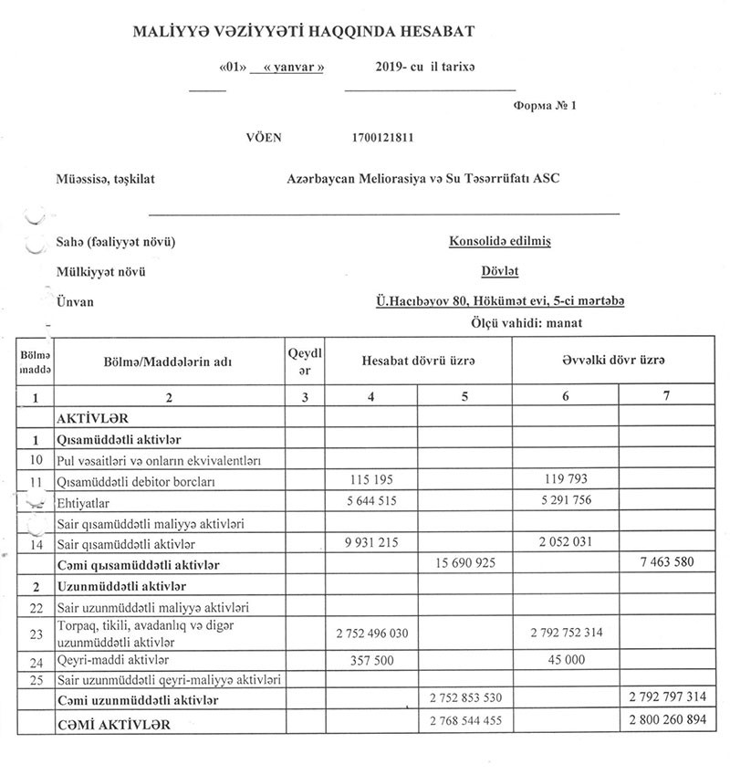 31 Dekabr 2018-ci il tarixində “Azərbaycan Meliorasiya və Su Təsərrüfatı” 2 milyard 769 milyon manat cəmi aktivlərə malik olub. Bu, 2017-ci ilin sonu ilə müqayisədə 1,1% azdır.