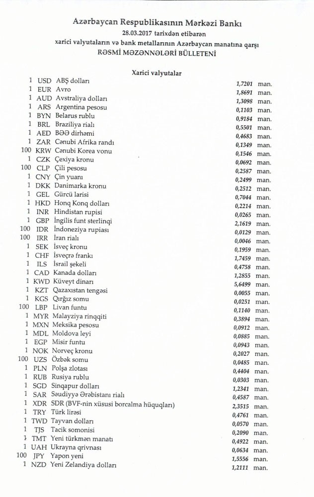 Martın 28-nə Mərkəzi Bankın açıqladığı rəsmi Dollar/manat məzənnəsi Martın 27-i ilə müqayisədə dəyişməyərək 1,7201 manat olub, Avro/manat məzənnəsi isə 1.8691 manata qalxıb.