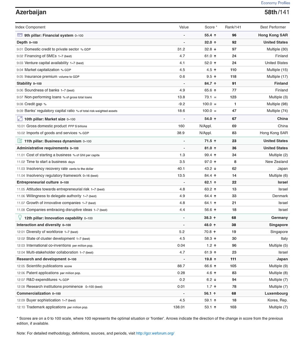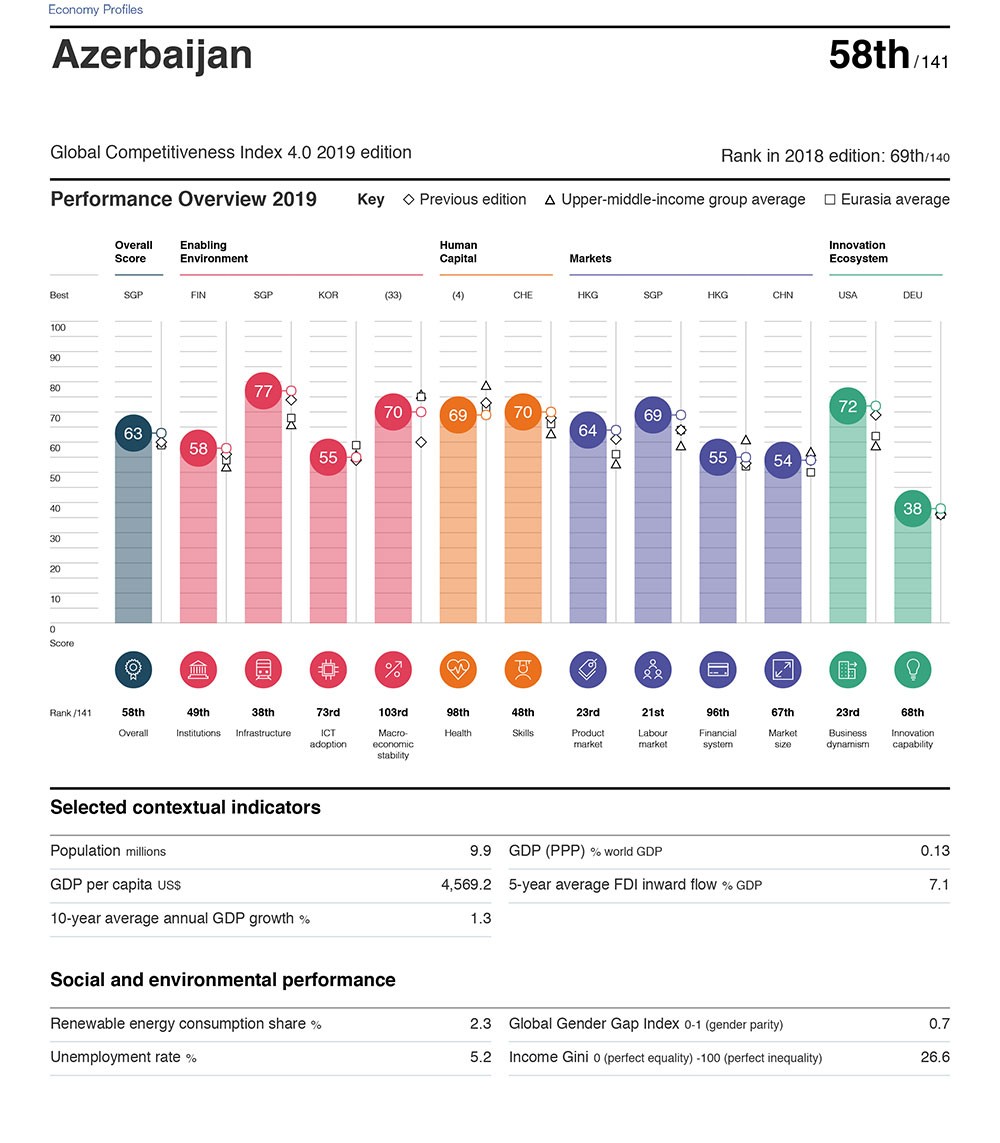 Azərbaycan Ümumdünya İqtisadi Forumunun 2019-cu il üzrə qlobal rəqabətə davamlıq reytinqində 11 pillə irəliləyib.