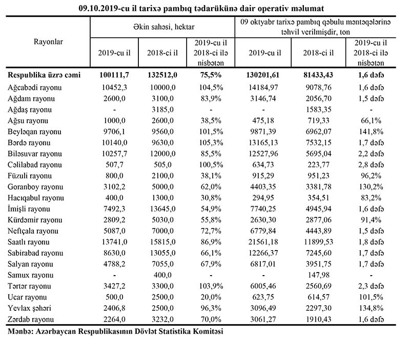Dövlət Statistika Komitəsindən bildiriblər ki, bu, ötən ilin eyni dövrü ilə müqayisədə 1,6 dəfə çoxdur. Keçən il oktyabrın 9-dək 81 min 433 ton pambıq tədarük olunmuşdu.