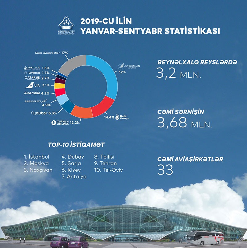 2019-cu ilin sentyabr ayında Heydər Əliyev Beynəlxalq Aeroportundan 60-dan çox müxtəlif istiqamətə 33 sərnişin aviaşirkəti uçuşlar həyata keçirmişdir.